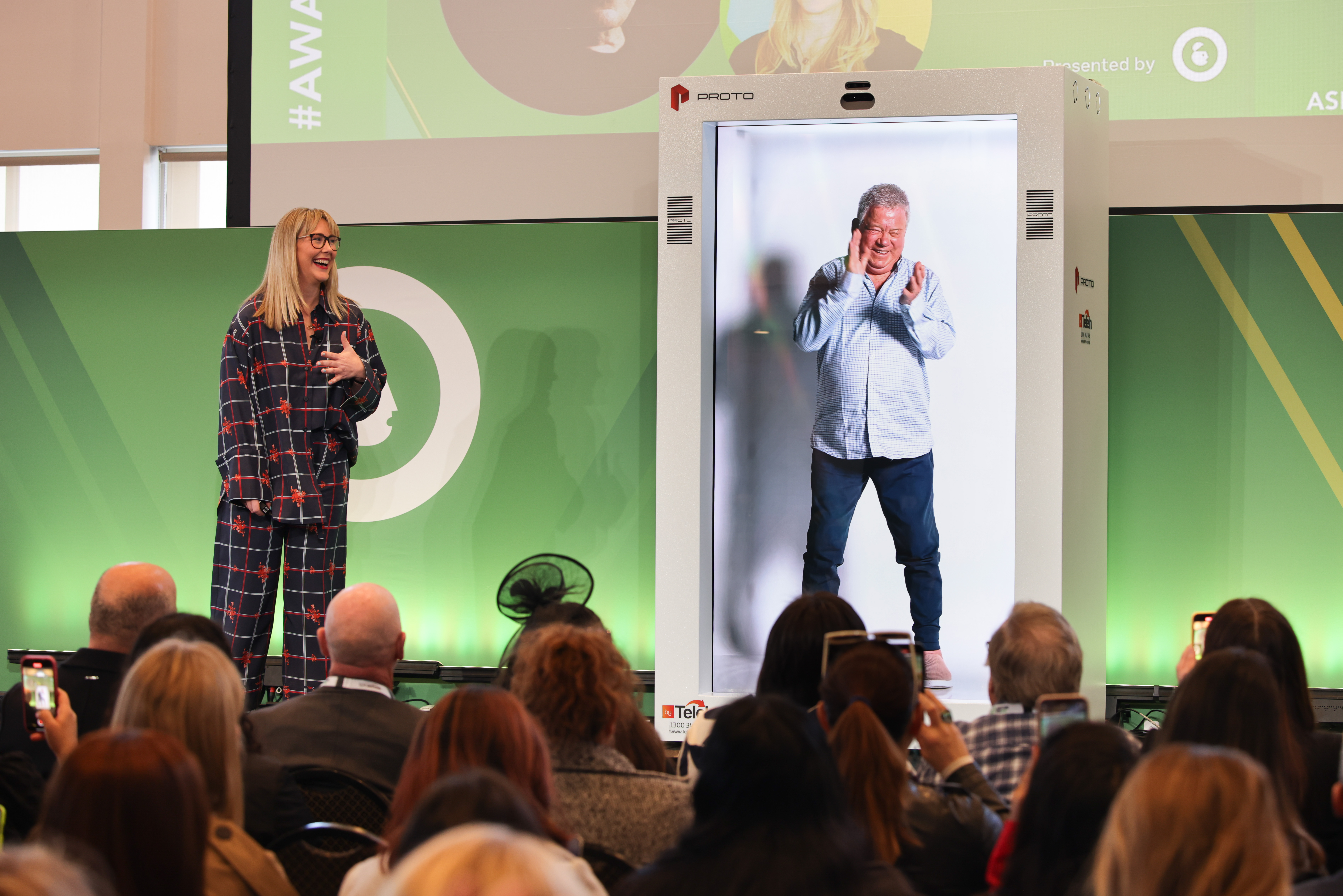Los Angeles, CA | Sydney, Australia, Aug. 03, 2023 (GLOBE NEWSWIRE) -- Proto Inc. announced today that William Shatner has joined the company as an advisor and used the technology for the first time to beam live, giving a keynote in Sydney, Australia. Mr. Shatner was able to see and hear the audience at Advertising Week APAC 2023 and the host, Catherine Bowe, Client Council & Industry Trade Lead, Meta APAC, and respond in real time across 7500 miles – just as if he was in the room.