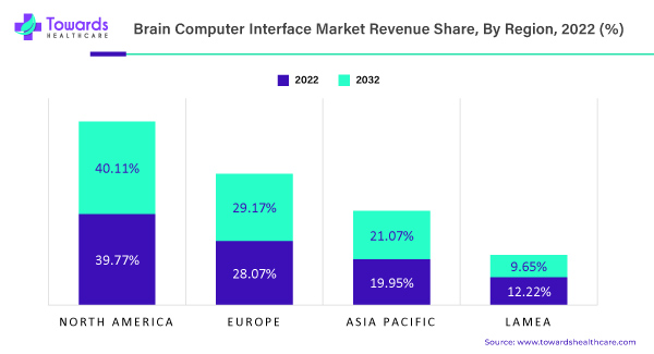 North America is a leading region in the brain-computer interface market due to the presence of key players. The increasing prevalence of neurological disorders and the high adoption rate of advanced technology in the region have also contributed to the growth of the market. North America held around 39.77 % market share in 2022, while Asia Pacific is projected to register the fastest growth with a CAGR of 17.3% (2023-2030).