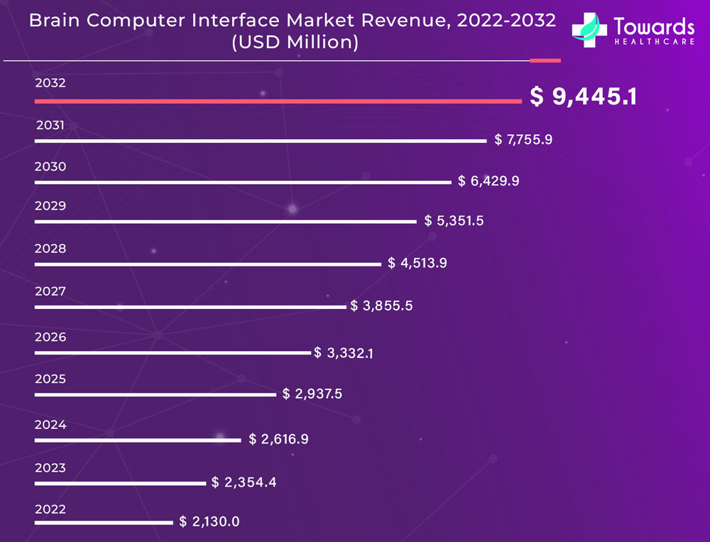 Ottwawa, Aug. 22, 2023 (GLOBE NEWSWIRE) -- As indicated by research conducted by Towards Healthcare a sister firm of Precedence Research, the global market for brain computer interface is set to expand significantly. Starting from USD 2,354.4 million in 2023, it is anticipated that this market will exhibit remarkable growth and reach a valuation of approximately USD 9,445.1 million by 2032.