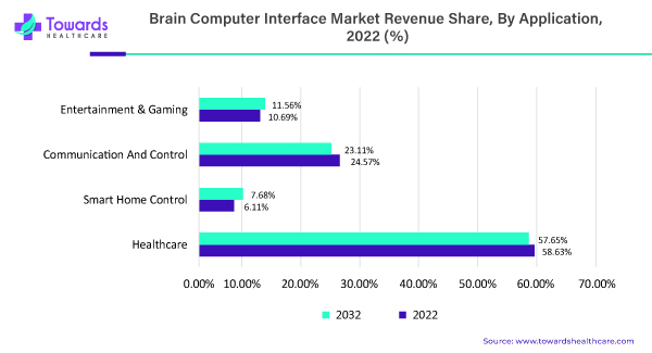 Brain-computer interfaces (BCIs) are a rapidly developing field of technology that allows for direct communication between the human brain and computers or other electronic devices. BCIs have a wide range of potential applications, including in healthcare, communication & control, smart home control, and entertainment & gaming. The healthcare industry is the currently leading and the largest contributor with the highest 58.63% market share in the BCI market in 2022. While smart home control applications are projected to grow at the fastest CAGR of 19.4% over the forecast period.