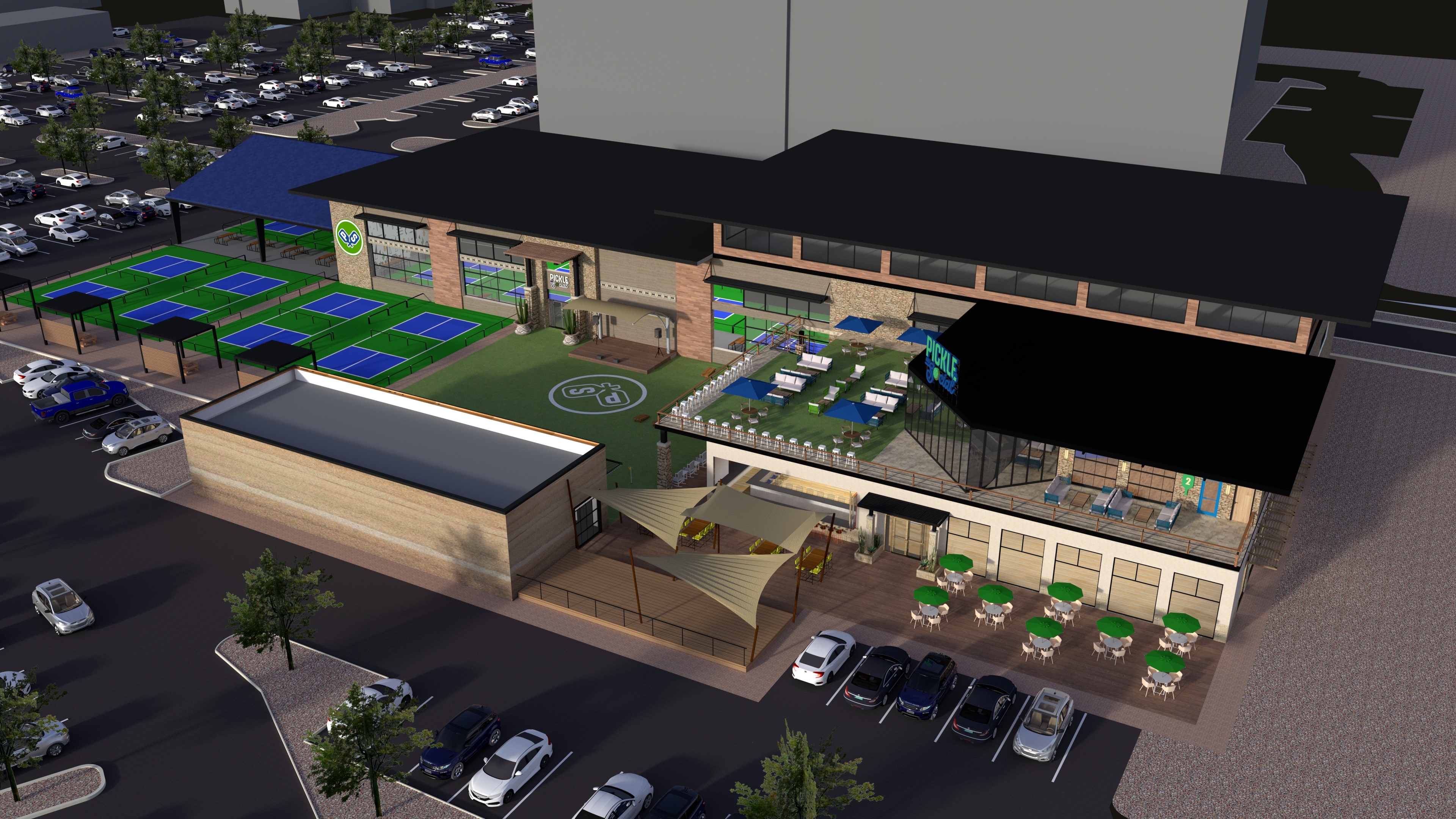 - Seven Pickle and Social Venues - featuring world class indoor and outdoor pickleball courts and in most cases 4 Fairway simulator luxury bays plus craft food, signature drinks, and live entertainment